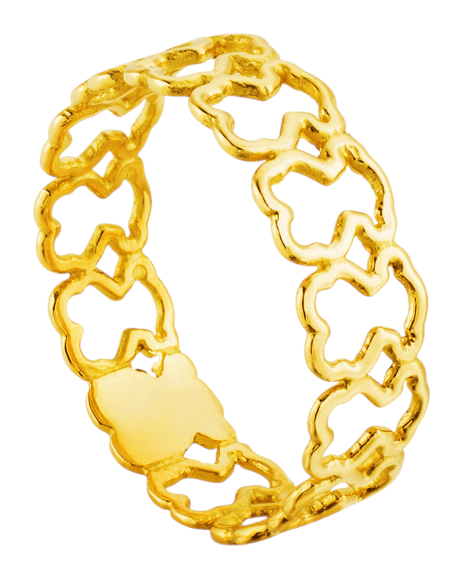 El anillo Tous silueta de oso dorado refleja la esencia más icónica y delicada de la marca. Su diseño entrelazado forma una cadena continua de ositos que envuelven el dedo con brillo y armonía. Con un acabado pulido de alto resplandor, este anillo simboliza ternura y estilo contemporáneo, ideal para mujeres que buscan una joya distintiva y sofisticada. Perfecto para usar solo o combinado con otras piezas Tous, aporta un toque luminoso y elegante que realza cualquier look con sutileza y personalidad.